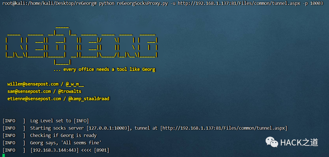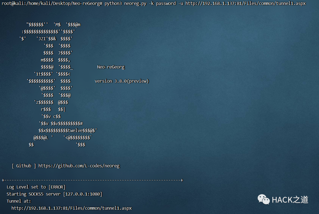$ python reGeorgSocksProxy.py -p 8080 -u http://upload.sensepost.net:8080/tunnel/tunnel.jspNeo-reGeorg
