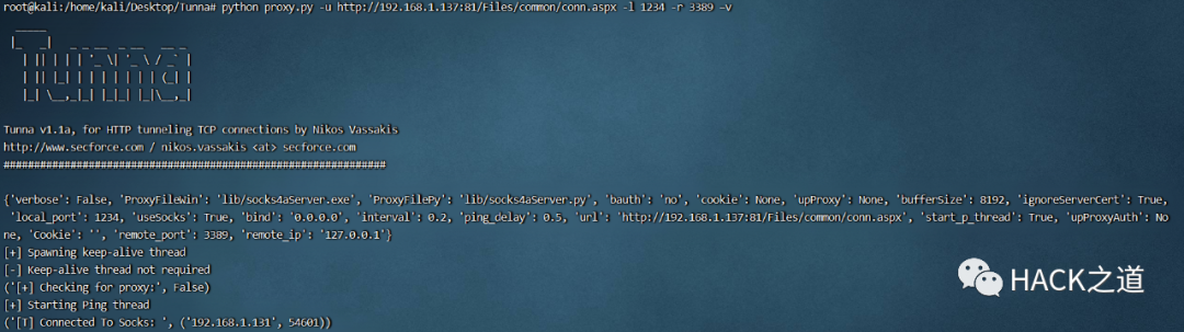 python proxy.py -u http://192.168.1.137:81/Files/common/conn.aspx -l 1234 -r 3389 –vpython proxy.py -u http://192.168.1.137:81/Files/common/conn.aspx -l 1234 -a 192.168.3.144 -r 3389