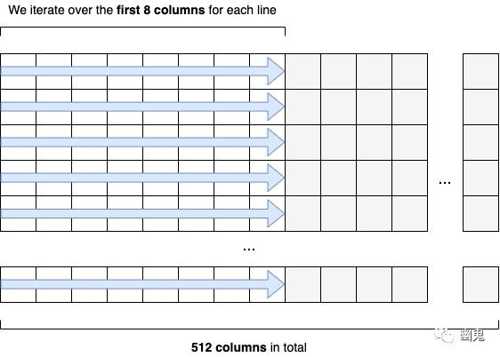 我们想要实现一个接收int64元素矩阵的函数。这个矩阵有固定的 512 列,我们要计算前 8 列的总和,如图 11.2 所示。