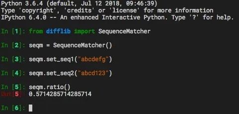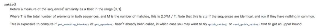 简单来说这个类使用了 Ratcliff 和 Obershelp 提供的算法,匹配最长相同的字符串,设定无关字符(junk)。在实际使用中,他们应用最多的方法应该就是 ratio()。