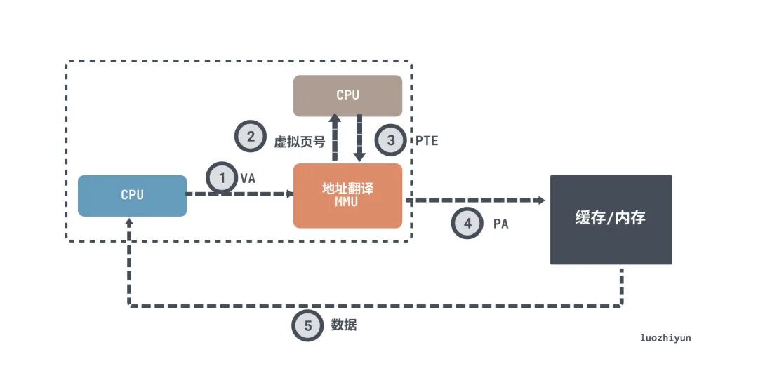 如上图,CPU 访问主存的时候会将一个虚拟地址(virtual address)被内存管理单元(Memory Management Unint, MMU)进行翻译成物理地址 PA(physical address) 才能访问。