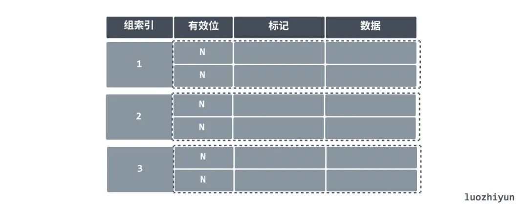组相联就是使用组索引代替了原来的索引,下图中表示每组有 2 行数据,通过组索引找到对应的数据行之后通过有效位和标记对组中每一行进行检索,如果能匹配上就说明命中。