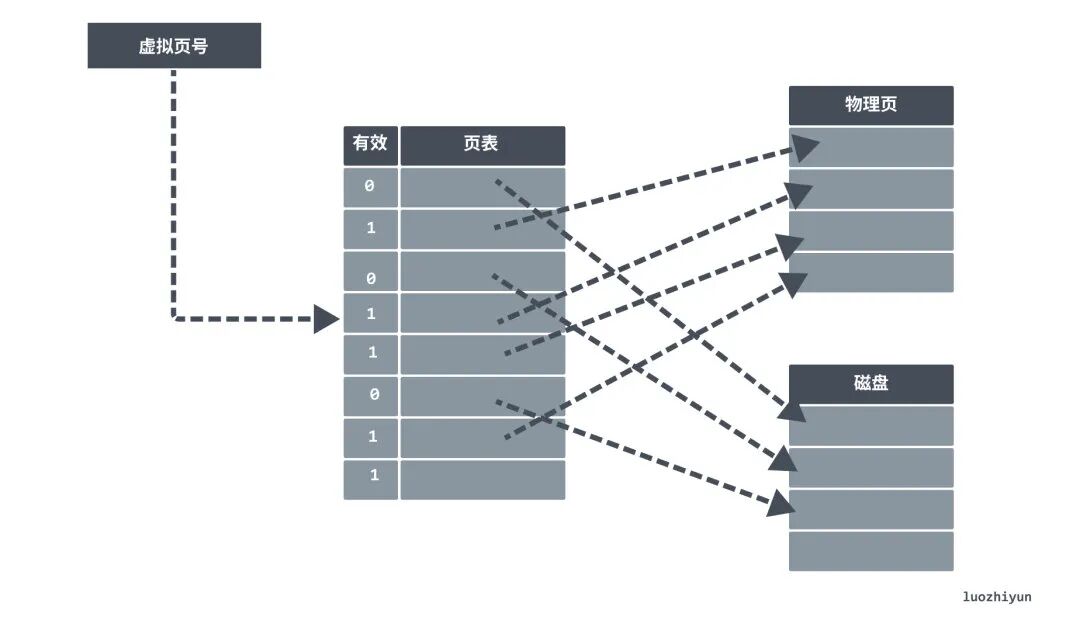 查找方式和上面说的组相联类似,首先使用虚拟页号作为索引去页表中找到对应的物理页号,页表中还会有 1 位表示有效位,如果该位无效就不在主存中,发生一次缺页;如果有效,那么就可以拿到对应的物理页号获取到对应的物理页位置,再根据偏移量得到物理内存地址。