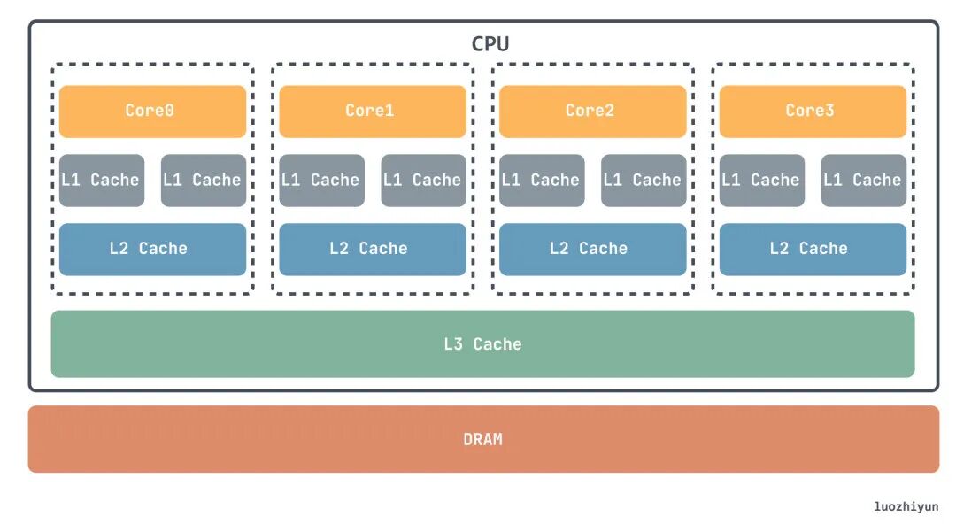 目前 SRAM 主要集成在 CPU 里面,每个 CPU 核心都有一块属于自己的 L1 高速缓存,通常分成指令缓存和数据缓存,分开存放 CPU 使用的指令和数据。L2 的 Cache 同样是每个 CPU 核心都有的,不过它往往不在 CPU 核心的内部。所以,L2 cache 的访问速度会比 L1 稍微慢一些。而 L3 cache ,则通常是多个 CPU 核心共用的。