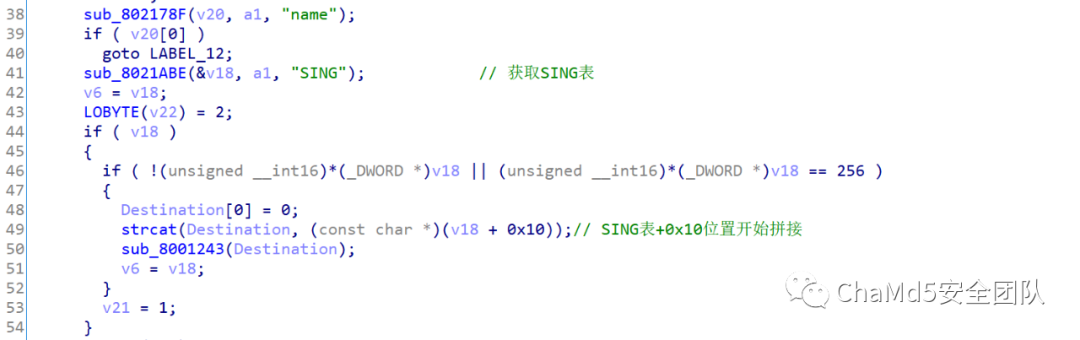 SING 表结构如下,根据 SING 表结构我们可以知道,669688c0 开始是 uniqueName 字段位置,直到 \X00 停止,明显可以看出,uniqueName 字段是超长的,因此直接用 strcat 拼接会导致溢出发生。