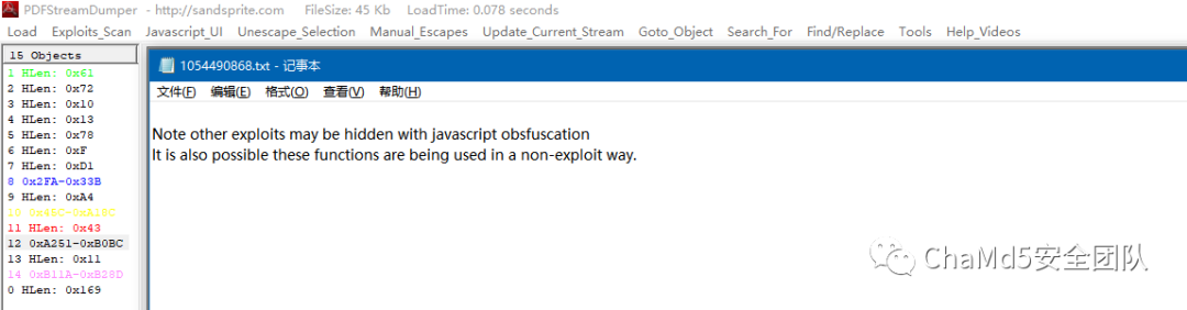 利用 PDFStreamDumper 直接执行漏洞检测,并没有产生结果,因为 JavaScript 经过混淆,单纯的静态检测难以捕捉: