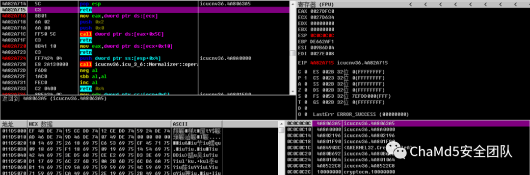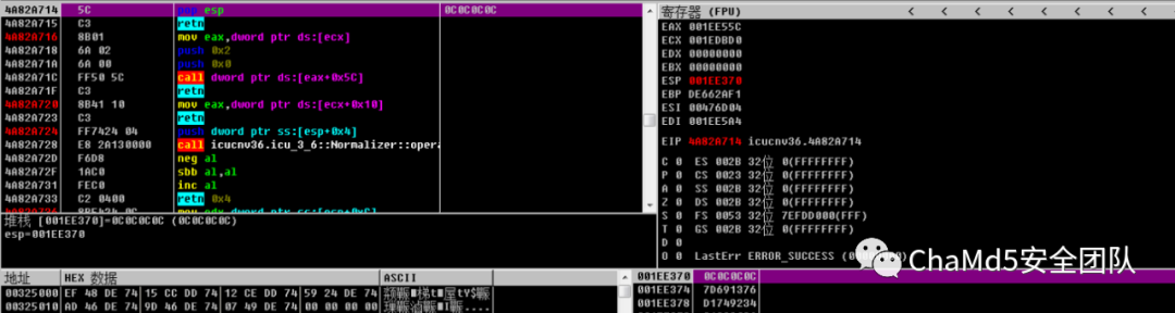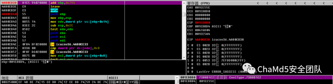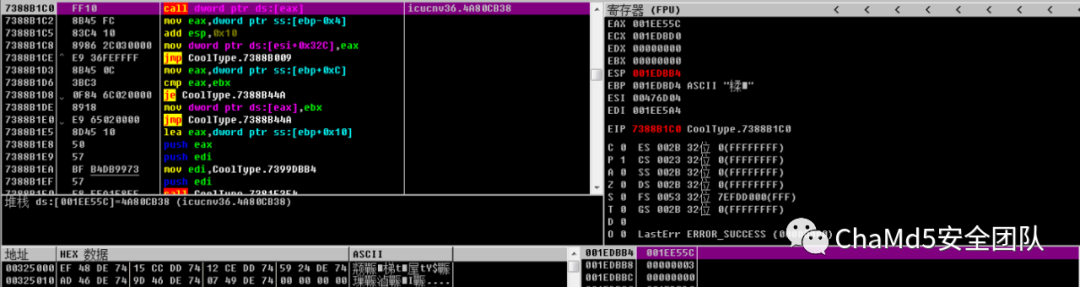 在 4A80CB38 设置内存访问断点,可以看到调用位置,此处原本是要调用 CoolType.738832B5 函数,但是由于栈溢出,该指针被修改为了我们设置的劫持地址,进而被劫持并实现后续攻击。