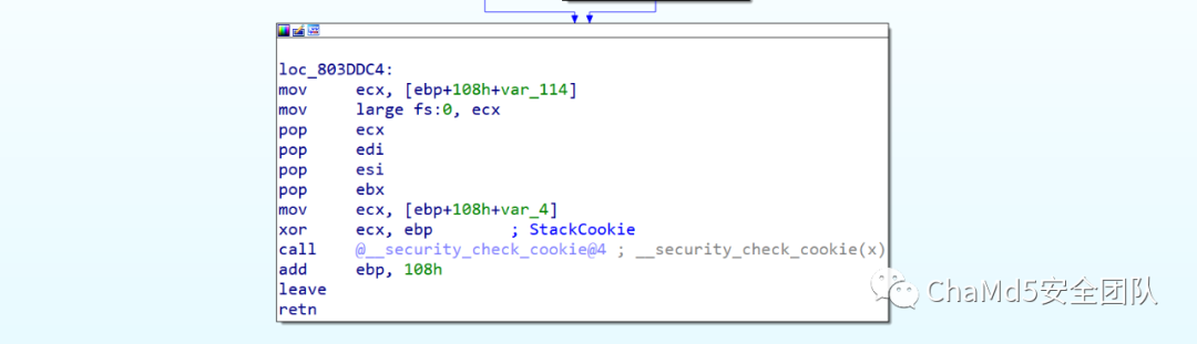 通过调试发现,漏洞的溢出原理不是覆盖返回地址,而是通过溢出修改栈上的一处被作为函数指针调用的参数,实现控制流劫持。因为对漏洞函数返回处的指令分析可以得到,函数是带有canary保护的: