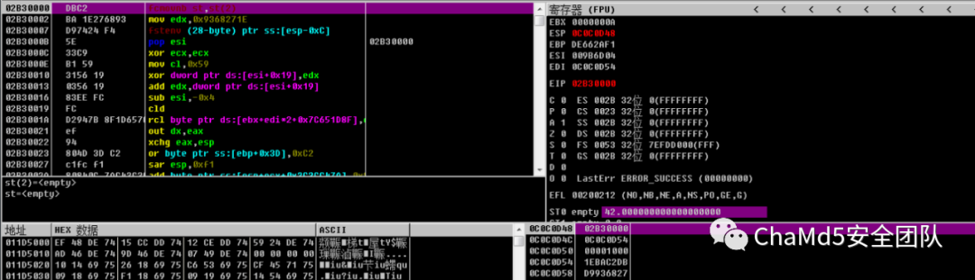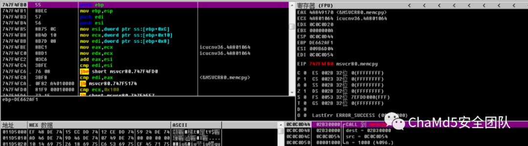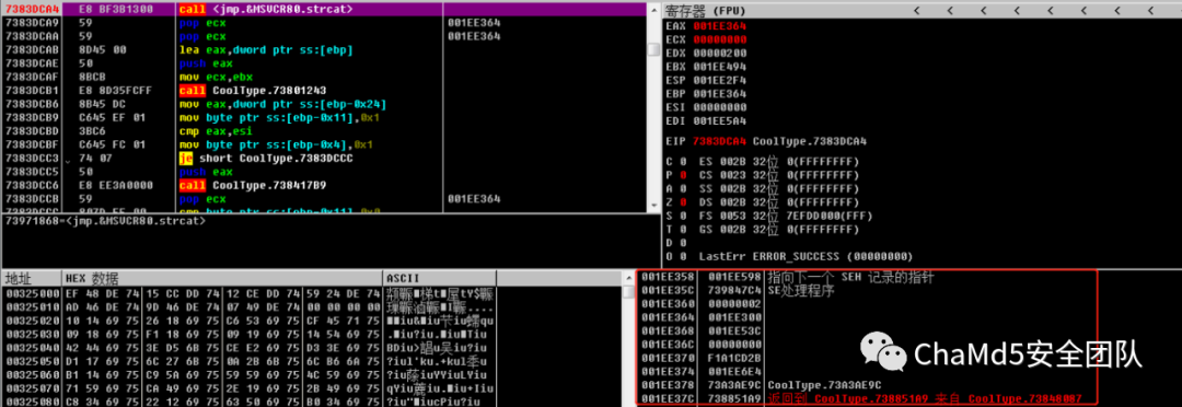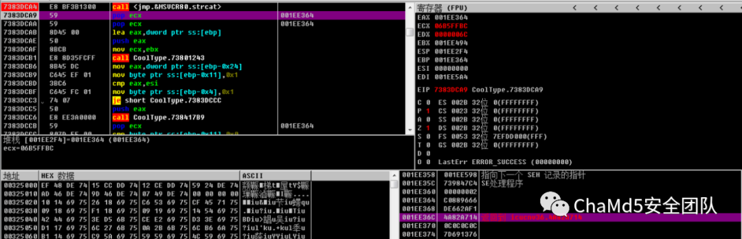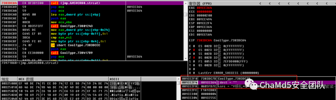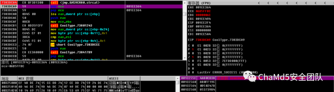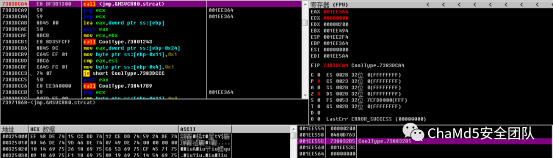 我们进行调试,在 strcat 函数执行处下断,此时 strcat 的目标地址为 1EE364: