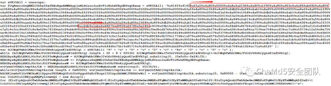 0C0C0C0C 地址处的 ROP 链和后续 memcpy 复制的 shellcode 是由 JavaScript 提前布局好的,在 Adobe 解析恶意 PDF 文档时,该 JavaScript 代码被执行,做好了内存的布局,前面是 ROP 链的构造,后面是 shellcode 的构造