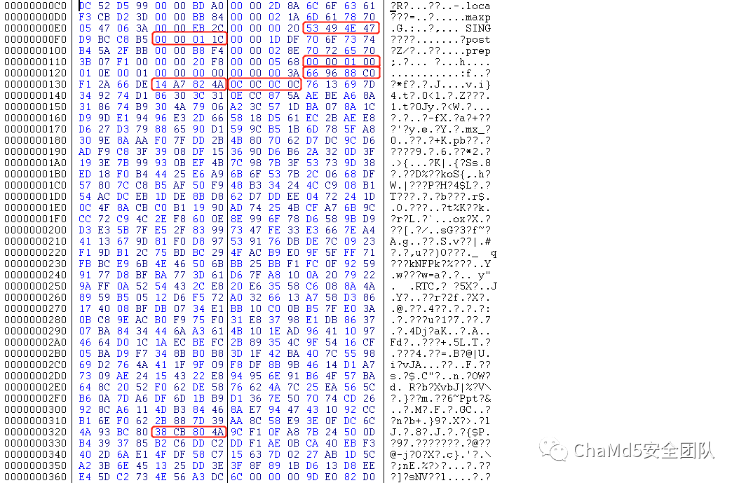 SING 表用于解析文件 TTF 字体,因此需要首先澄清一下TTF结构与 SING 表结构。TTF 结构如下,前 4 字节为表标识,如图即为字符串 SING,之后四字节为校验和,再之后四字节为实表偏移,因此我们知道,SING 表的实际存储位置为 0x11C,也就是从字节 00000100 开始。