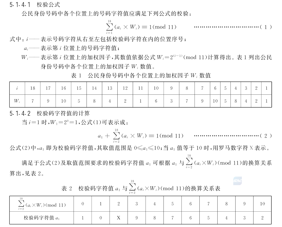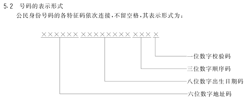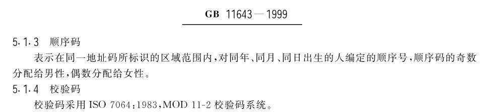 身份证号显示前6位和最后一位,出生日期全部显示,同时标注性别,那么此处得到身份证前14位和最后一位校验位。有了15位就差3位数字。文件地址:https://openstd.samr.gov.cn/bzgk/gb/newGbInfo?hcno=080D6FBF2BB468F9007657F26D60013E![]()