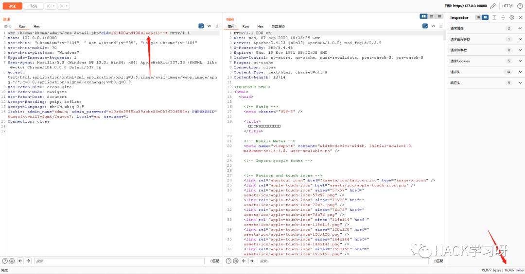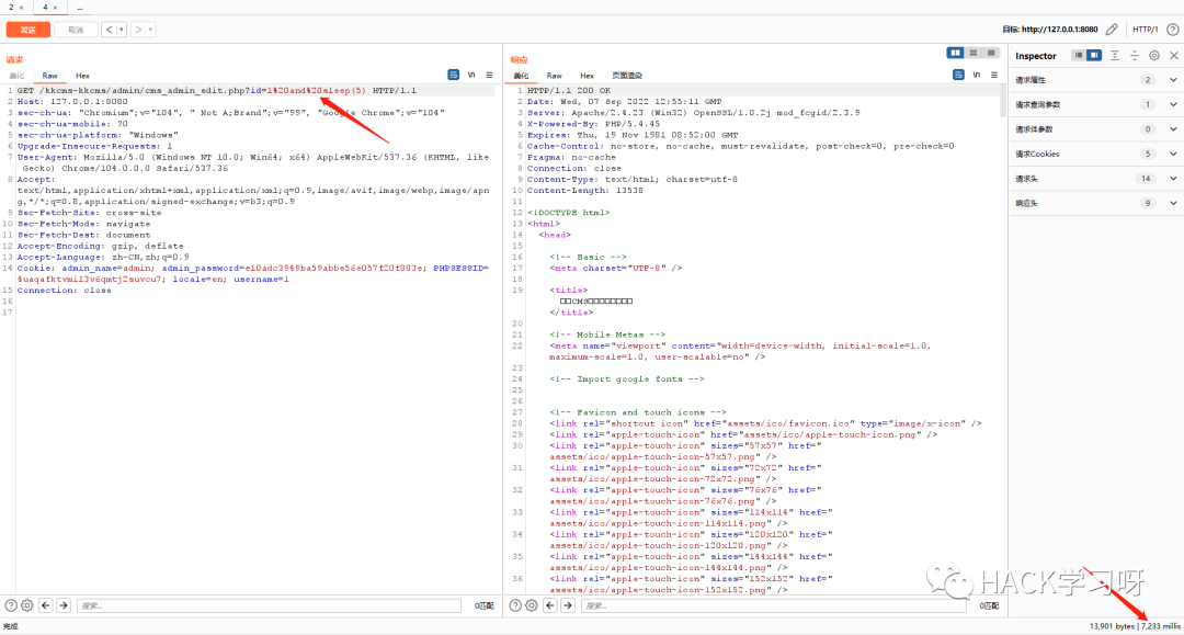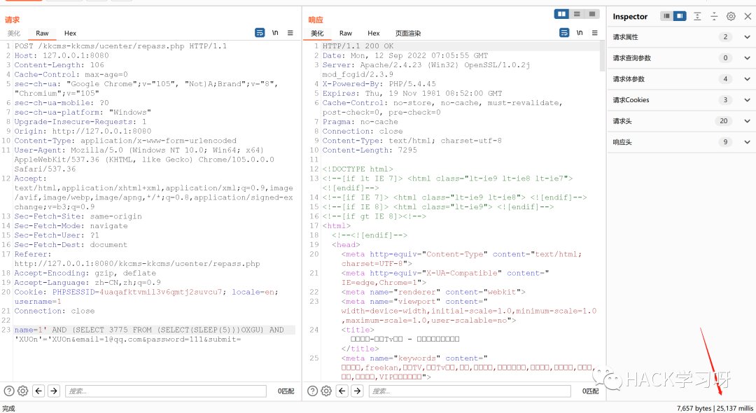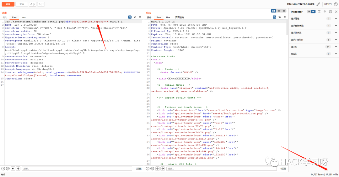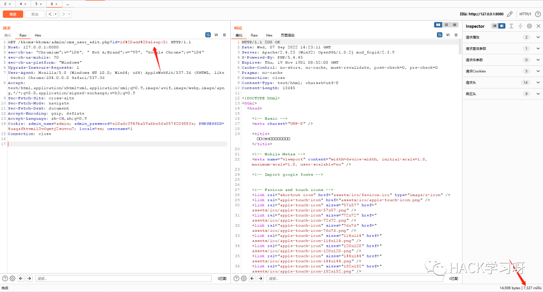 发现两者回显时间不同,说明存在SQL注入,具体为时间盲注,这里就可以编写Python脚本来爆破数据库信息,也可以通过SQLmap,这里不再展示