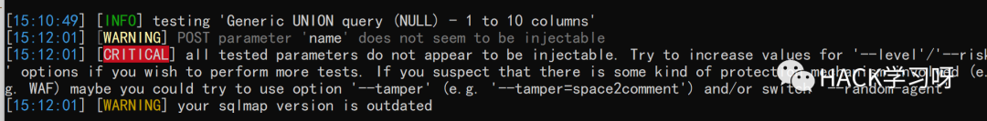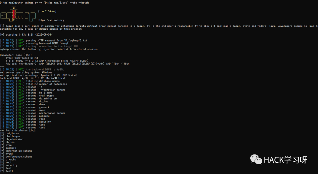 python sqlmap.py -r "D:\sqlmap\3.txt" -p name --dbs