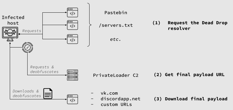 研究人员观察到,PrivateLoader是2022年使用最广泛的加载程序之一。Pay-Per-Install(PPI)服务使用它在受感染的主机上部署多个恶意负载。PPI是一种恶意软件服务,恶意软件运营商向PPI运营商提供有效载荷、请求的安装数量和目标地理位置。