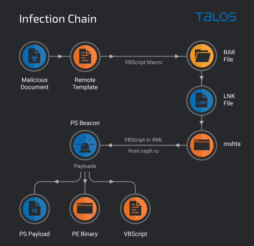 攻击者起初使用网络钓鱼电子邮件传递包含带有恶意VBScript宏的远程模板的Microsoft Office文档。这些宏下载并打开包含LNK文件的RAR档案,一旦打开,LNK将尝试执行MSHTA.EXE来下载并解析远程XML文件以便执行恶意PowerShell脚本。最后,攻击者则使用了一种定制的信息窃取程序:infostealer,它可以泄露特定文件类型并在受感染端点上部署额外的二进制和基于脚本的有效负载。