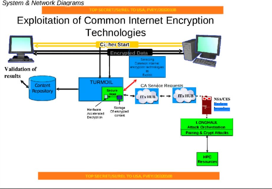 斯诺登泄露的公开文档中,曾展示了NSA的“TURMOIL(混乱)”解密网络流量技术的架构图。TURMOIL(混乱)这个加密流量解密服务类似于Blue Coat,流量解密部分依赖于相关CA服务。