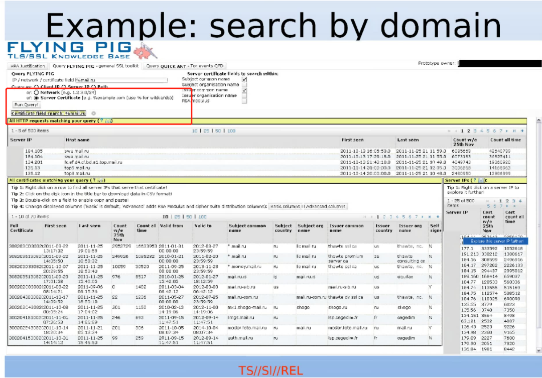 同样在斯诺登泄露的另外一份公开文档,相关的加密流量监听项目FLYING PIG项目里,NSA居然可以根据搜索证书信息劫持监听特定的电子邮件。