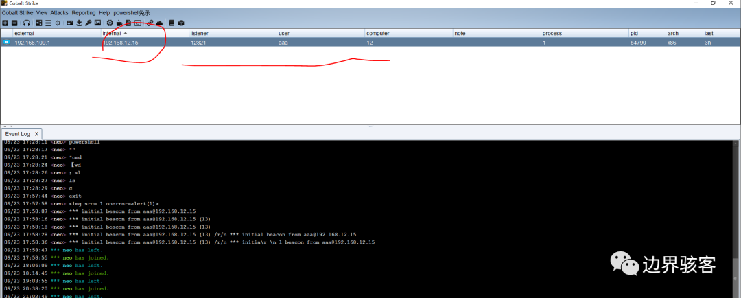 <HTML><IMG SRC=http://1.1.1.1/1.jpg>到CS客户端上查看可以发现CS已经上线,并且user字段已经HTML渲染并发生图裂了