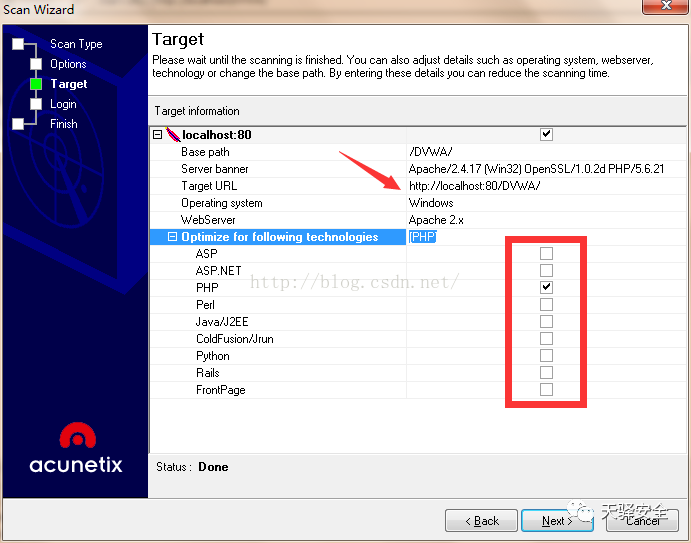 AWVS会自动监测当前往网站的banner和system这对于后面的进一步监测非常重要,在下方选择甲脚本语言。![]()