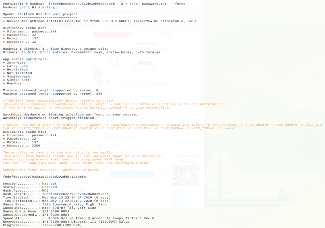 hashcat -a 7 f8def8bcecb2e7925a2b42d60d202deb ?d?d password.txt --force
