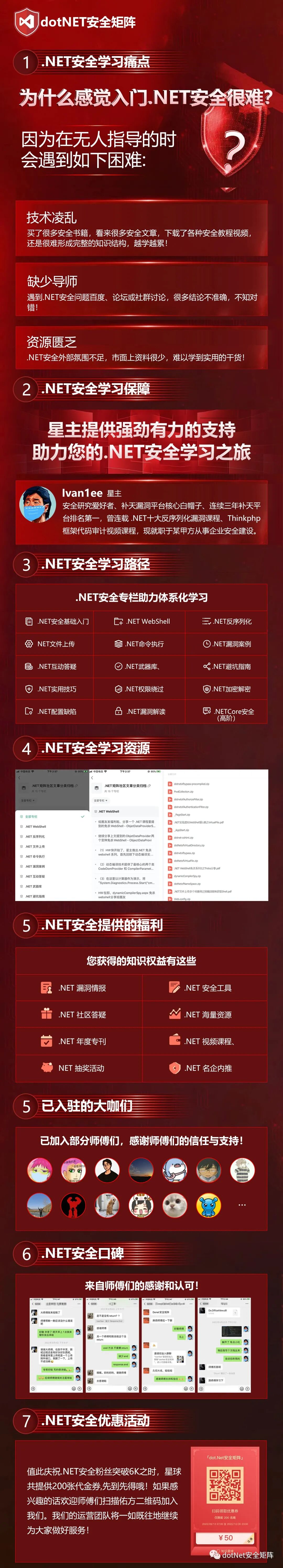 为了更好地应对基于.NET技术栈的风险识别和未知威胁,dotNet安全矩阵星球从创建以来一直聚焦于.NET领域的安全攻防技术,定位于高质量安全攻防星球社区,得到了许多师傅们的支持和信任,通过星球深度连接入圈的师傅们,一起推动.NET安全高质量的向前发展星球提供50元代金劵,师傅们先到先得噢!扫描星球亮点里的二维码即可加入我们。