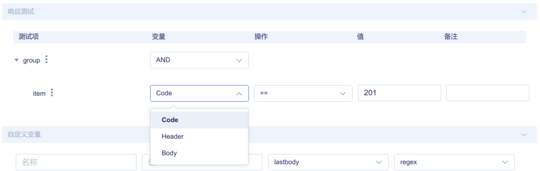 之后的“响应测试”可对Response进行判断可选有返回状态码,Header和Body,大家按照自己需求点一点即可。
