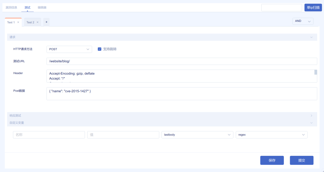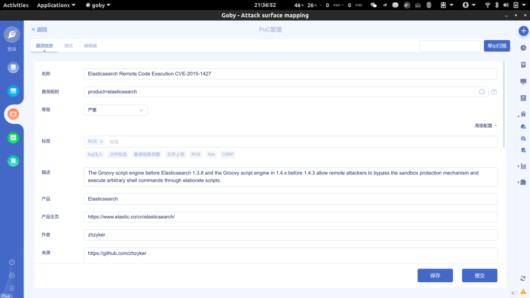 上图就能看到自定义PoC的界面样子了,具体填写的信息和填写标准参考上述的《Goby漏洞编写指南》,里边有命名规则等详细解释和参考