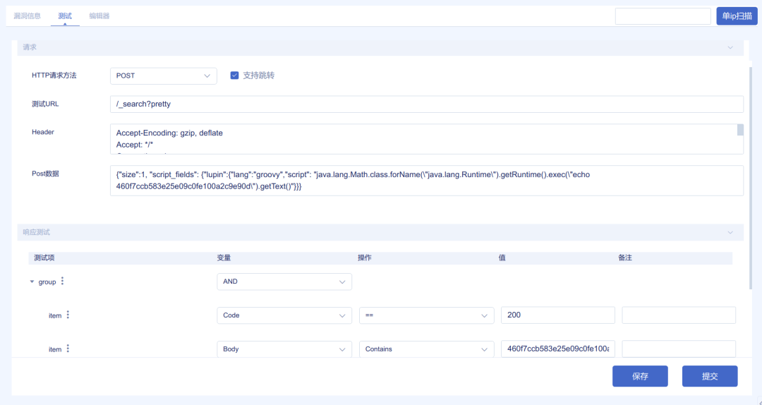 到这里两次Requests好了,最终的RCE判断也好了剩下就是测试PoC可用性了,上图所示右上角提供了“单ip扫描”直接测试。