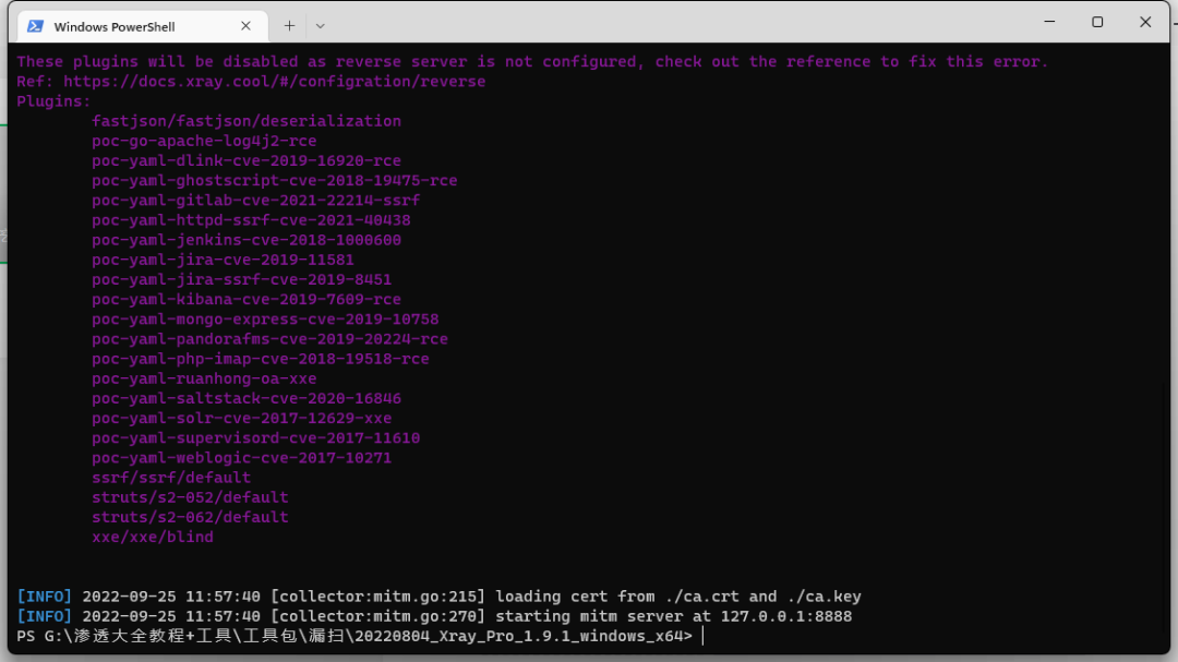 然后启动cmd进入到xray所在目录下,这里也可以ctrl+shift+鼠标右键,然后选择powershell打开,就可以直接在当前目录下执行命令,不必再去敲cd,打开命令行后执行以下语句: