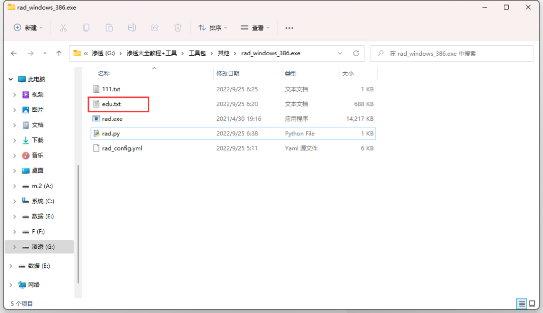 4、准备xray,解压xray压缩包,首次运行直接双击xray.exe,会生成两个文件在目录下,然后文本格式打开config.yaml文件,ctrl+f搜索edu,把搜索到的唯一的一行删除,因为xray默认不扫edu