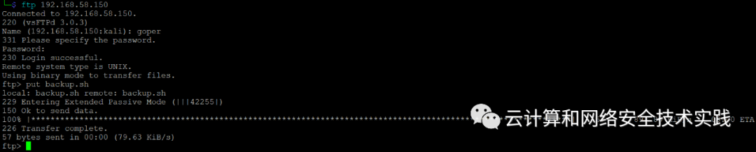 通过ftp上传,上传之前在kali攻击机上开个反弹shell监听,nc -lvp 4444,