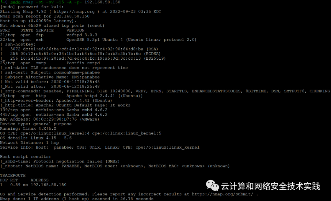 继续进行端口扫描,sudo nmap -sS -sV -T5 -A -p- 192.168.58.150,