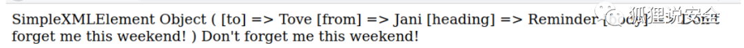 SimpleXMLElement Object ( [to] => Tove [from] => Jani [heading] => Reminder [body]=> Don't forget me this weekend! )