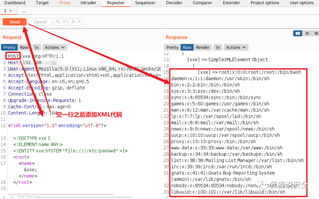 file:///etc/passwd。在解析 XML 文档的过程中,实体 'xxe' 的值会被替换为