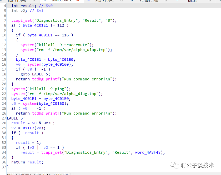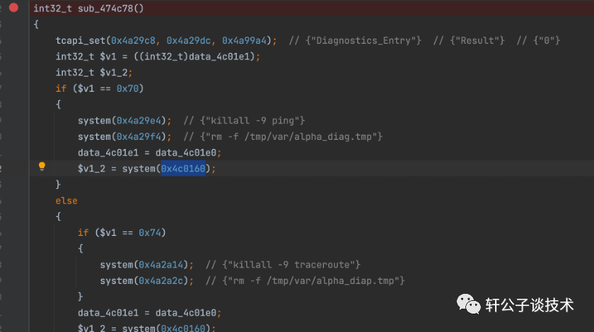 sub_474c78 中存在system函数,函数的数据是byte_4c0160带入,执行命令sub_474AC8函数中的byte_4c0160数据由v9传递,v9 由a1,a2控制a1 a2 由start_routine函数中tcapi_set语句控制参数再由前端Diagnostics.asp页面中产生的