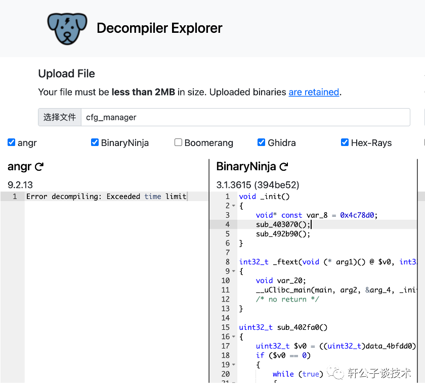 推荐一个网站,可以将二进制文件全部转化为c语言,缺点就是不完整,他会把一些函数当作16进制数据,也不能跳转分析,