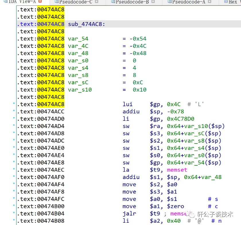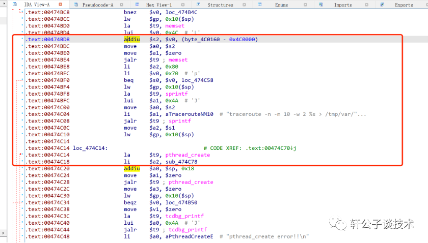 .text:00474BD8 addiu $s2, $v0, (byte_4C0160 - 0x4C0000).text:00474BDC move $a0, $s2.text:00474BE0 move $a1, $zero.text:00474BE4 jalr $t9 ; memset.text:00474BE8 li $a2, 0x80.text:00474BEC li $v0, 0x70 # 'p'.text:00474BF0 beq $s0, $v0, loc_474C58.text:00474BF4 lw $gp, 0x10($sp).text:00474BF8 la $t9, sprintf.text:00474BFC lui $a1, 0x4A # 'J'.text:00474C00 move $a0, $s2.text:00474C04 li $a1, aTracerouteNM10 # "traceroute -n -m 10 -w 2 %s > /tmp/var/"....text:00474C08 jalr $t9 ; sprintf.text:00474C0C move $a2, $s1.text:00474C10 lw $gp, 0x10($sp).text:00474C14.text:00474C14 loc_474C14: # CODE XREF: .text:00474C70↓j.text:00474C14 la $t9, pthread_create.text:00474C18 li $a2, sub_474C78