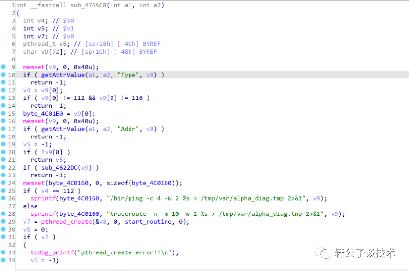 如果a1和a2可控,v9就就会被执行,然后就会执行start_routine,start_routine函数又和sub_474C78一样