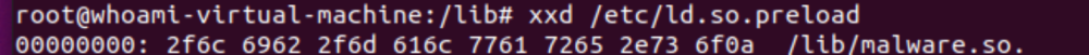 以十六进制的形式查看/etc/ld.so.preload,如下图,可以发现:在我们往配置文件中添加了要加载的.so文件后,可以直接看到相关数据和字符串