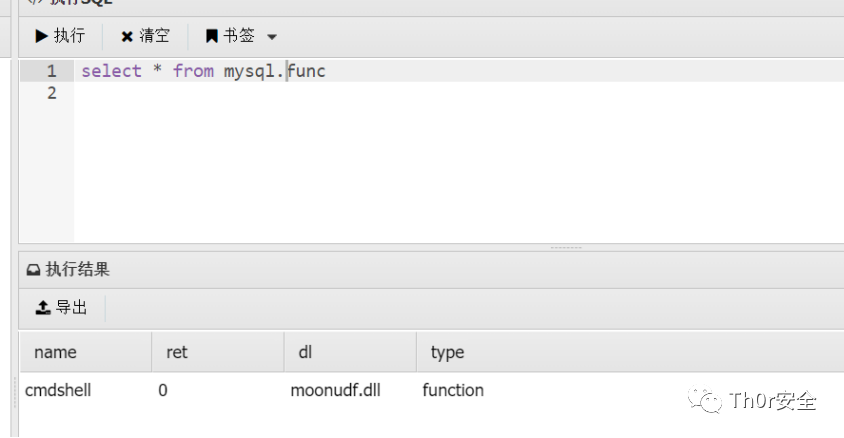 由于udf.dll文件引入mysql中时其中的函数会被作为mysql函数使用,因此可通过自定义函数来执行系统命令。